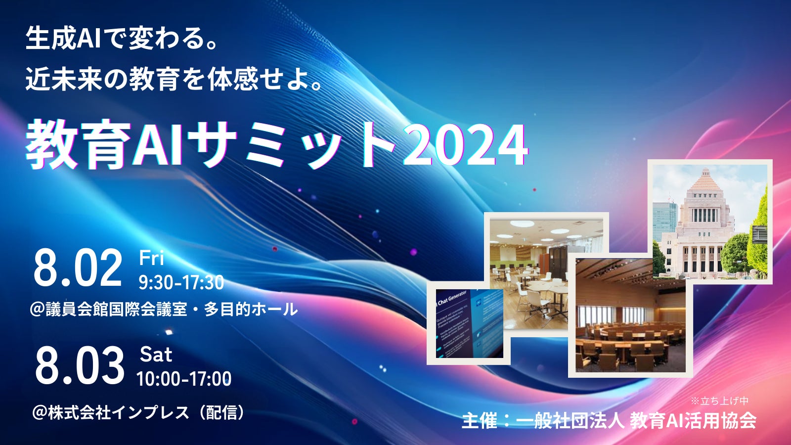 一般社団法人教育AI活用協会(代表理事・佐藤雄太、設立準備中)は、教育×AIをテーマにした「教育AIサミット2024」を議員会館国際会議室、多目的ホール、株式会社インプレスを会場として開催いたします。