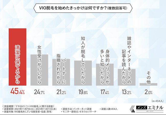 「VIO脱毛を始めたきっかけは何ですか?(複数回答可)」と質問したところ、『清潔に保てるから(45.4%)』と回答した方が最も多いという結果になりました。