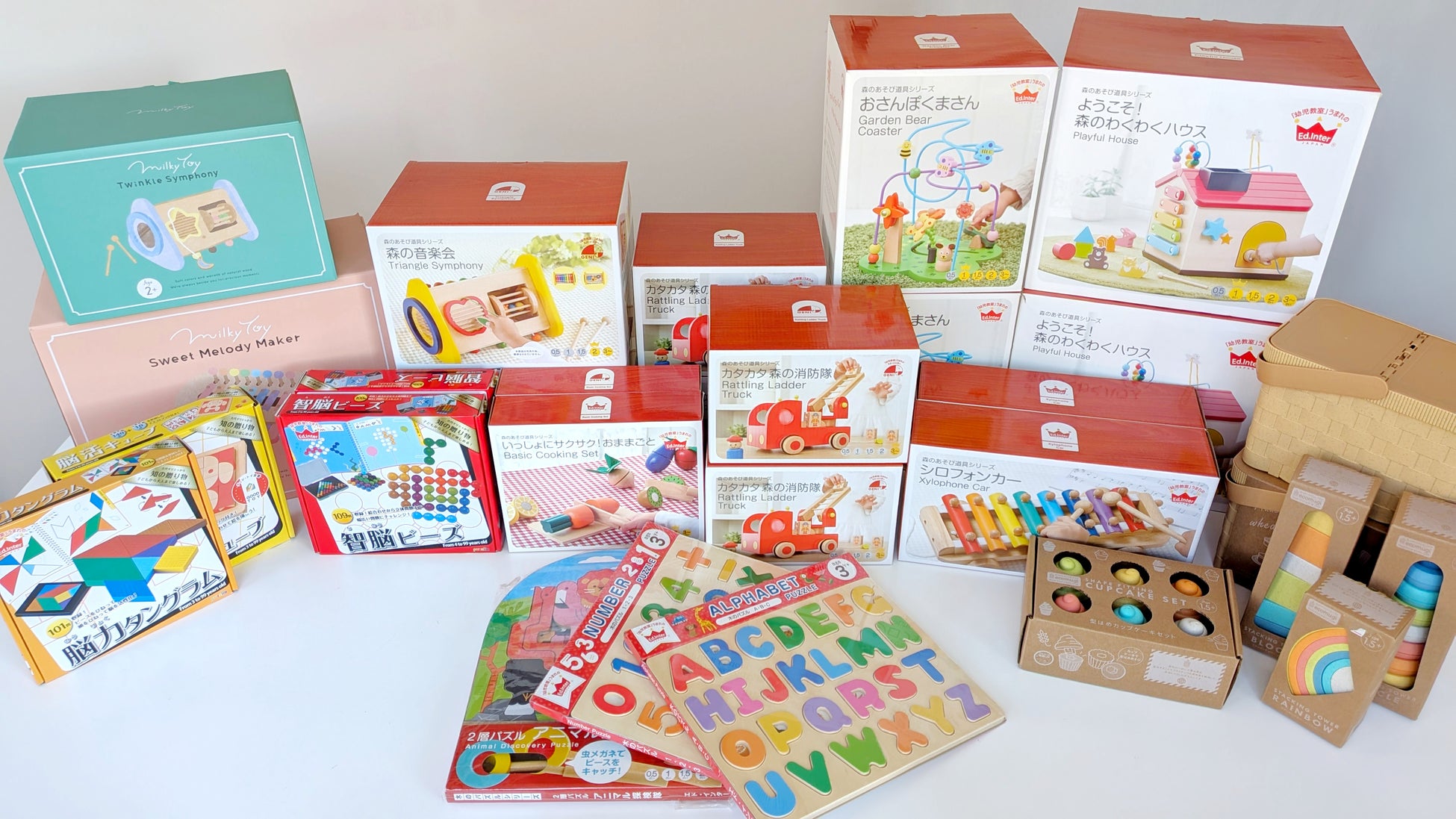 今回寄贈したのは、定番の知育あそびが楽しめる「森のあそび道具」シリーズをはじめ、優しい色合いの「ミルキートイ」シリーズ、外あそびにも使えるプラスチック製おもちゃ「ecomugi -エコムギ-」シリーズなど、幅広い年齢層に楽しんでいただける製品です。