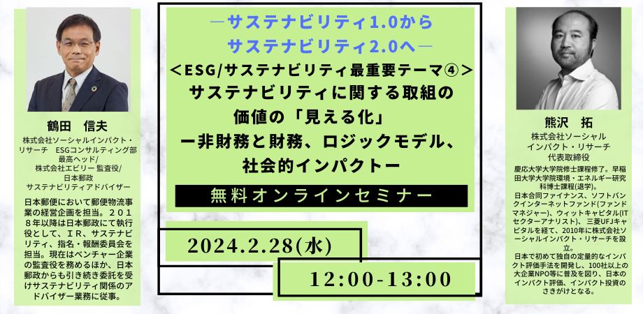 【2/28開催/参加無料】ESG/サステナビリティ最重要テーマ「サステナビリティに関する取組の価値の「見える化」ー非財務と財務、ロジックモデル、 社会的インパクトー」をテーマにしたセミナーを開催!
