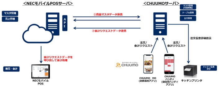 マミヤ・オーピー社提供の店内モバイルオーダーサービス「CHUUMO」と会計連携できるようになりました。注文情報管理、キッチンプリンタの提供、伝票印字等はCHUUMOの機能にて実施し、モバイルPOSでは会計処理のみを行う運用となります。