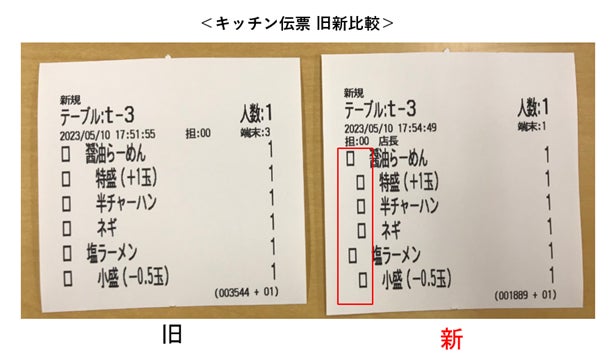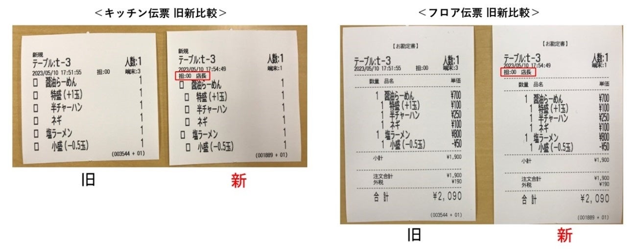キッチン伝票、フロア伝票に担当者コードだけでなく担当者名も併せて印字されるようになりました。これによりオーダー担当者の識別がよりしやすくなります。