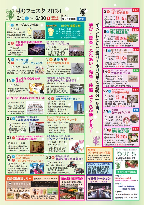 福井県坂井市の花「ゆり」の祭典、ゆりフェスタが6月1日から6月30日まで開催されます。開催期間中は15万輪のゆりの花が皆様をお出迎えします。開催初日のオープニング式典には坂井ほや丸も登場します。