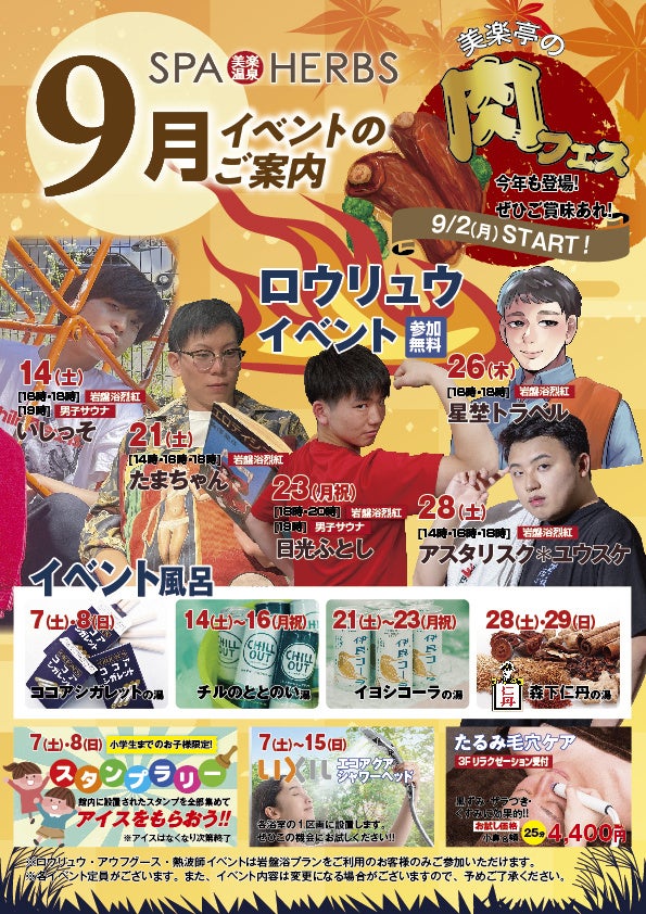 【残暑に負けないイベント盛りだくさん!】埼⽟最⼤級のスパリゾート「美楽温泉 SPA-HERBS」が9月イベントを続々開催!