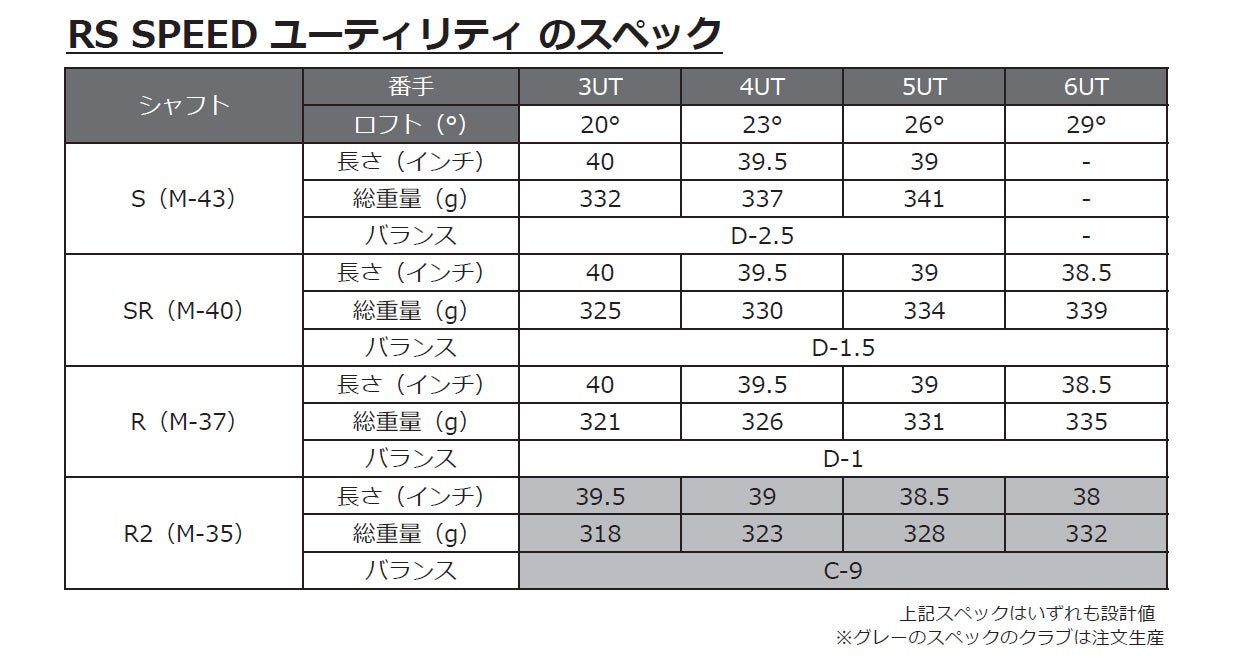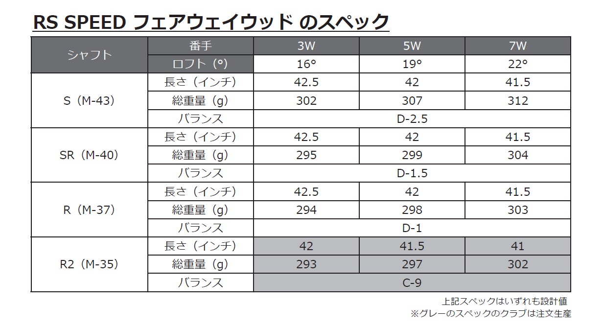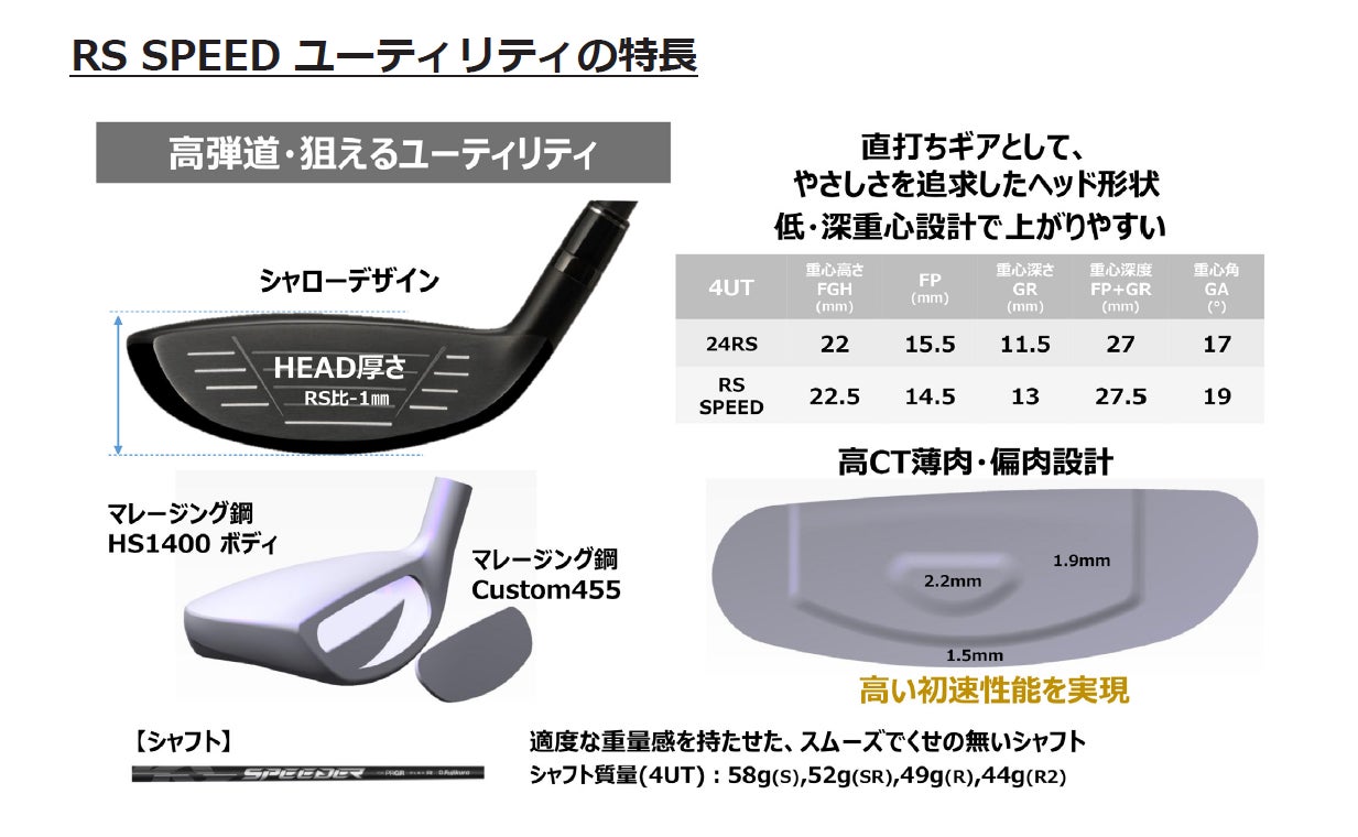 「RS SPEEDフェアウェイウッド」と「RS SPEEDユーティリティ」は、「RS」シリーズ最軽量設計でゴルファーがやさしく振り抜けるクラブとなっているほか、シャローデザインによる低・深重心設計で高弾道を可能にしました。また、高精度CNCミルド加工を施した偏肉設計の高強度マレージングフェースを採用することにより、高初速性能をしっかりと踏襲。このほか、フェアウェイウッドはネック長、ヘッド厚を抑えたヘッド形状でやさしい印象にするとともに、低・深重心設計とやや大きめなFP(フェース・プログレッション)でボールの上がりやすさを追求しました。シャフトは軽量かつ滑らかな剛性設計で振りやすく、高い打出しを得られるように仕上げています。ユーティリティは、ボールが上がりやすい低・深重心設計とやや投影面積の大きいシャローなヘッド形状で地面からの直打ちギアとしてのやさしさを追求しました。シャフトは適度な重量感とスムーズでくせの無い剛性設計で高弾道で狙えるクラブとなっています。