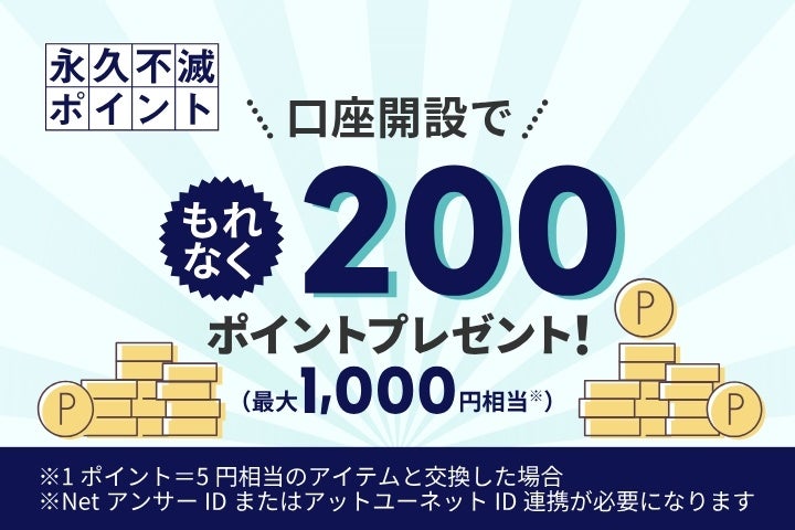 大和コネクト証券口座とクレディセゾンのNetアンサー/アットユーネットのIDを連携すると、永久不滅ポイント200ポイント(最大1,000円相当)プレゼント。アプリでの口座開設であれば、20ポイント(最大100円相当)上乗せしてプレゼント