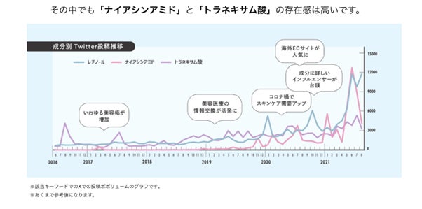 それを裏付けるように日本でも昨今、美容家や美容インフルエンサーがSNSで成分軸の投稿をすることが多く見られ、「トラネキサム酸」や「ナイアシンアミド」は存在感が高い傾向にあります。