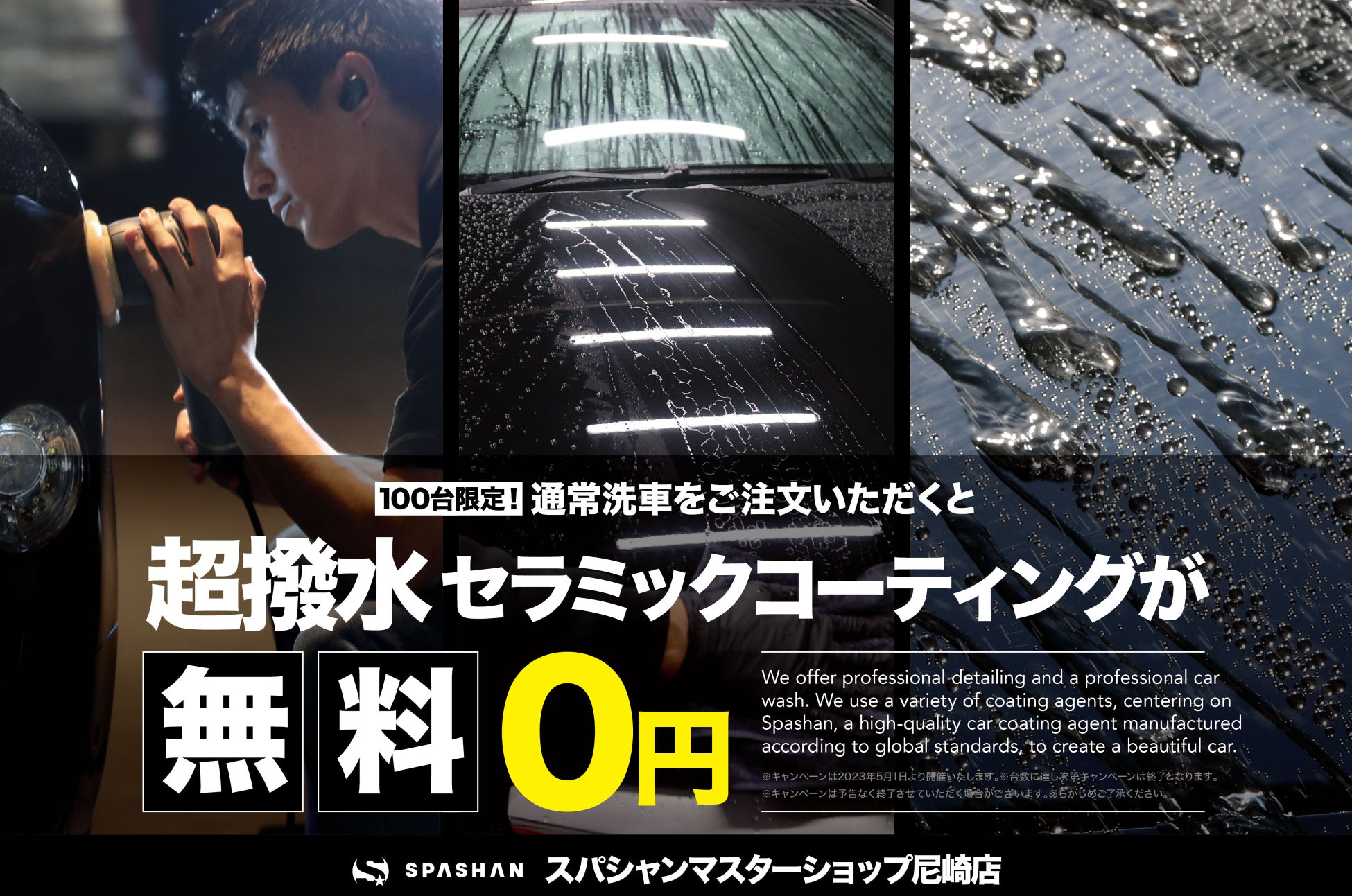 2023年5月1日よりスパシャンマスターショップ尼崎店にてベーシック洗車をご予約いただくと無料で超撥水セラミックコーティング施工を受けることができます。キャンペーン適応は下記電話番号に事前のご予約が必須になります。