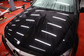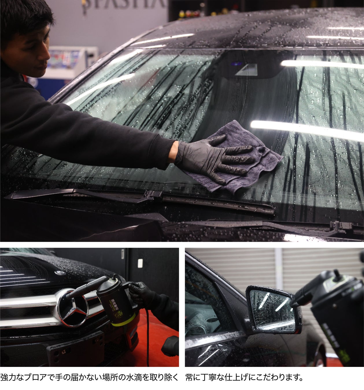 どんなに良いコーティング剤を使っても車の下地処理が悪ければせっかくのコーティング剤の性能を生かすことができません。(※下地処理:車の表面についた汚れをしっかりと落とすこと。さらに平滑なボディ面を得るためには車の表面に突き刺さった微細な鉄粉除去や雨水などに含まれる成分が影響した水アカなどを専用の溶剤を使い除去していきます。)