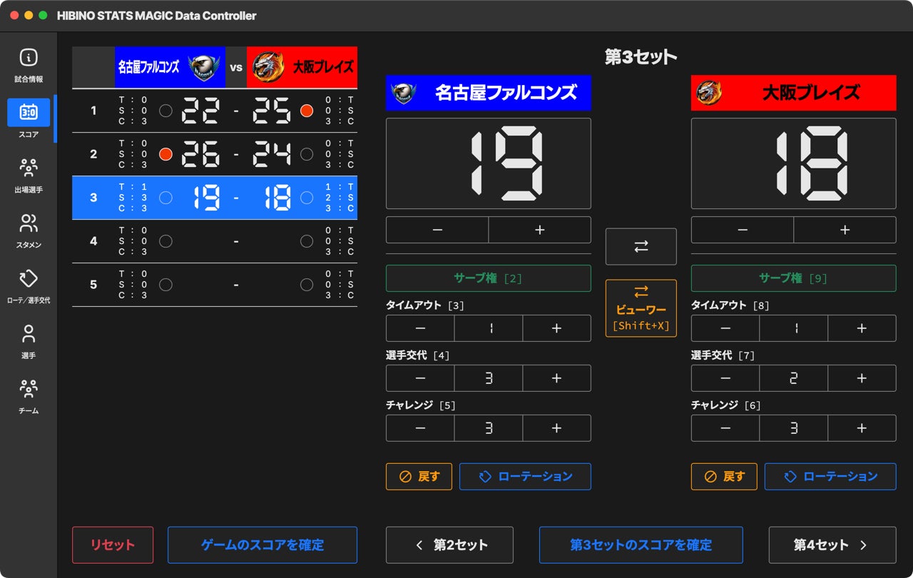 選手の配置はコート内の立ち位置に合わせており、ローテーションに合わせて自動的に動く仕組み。