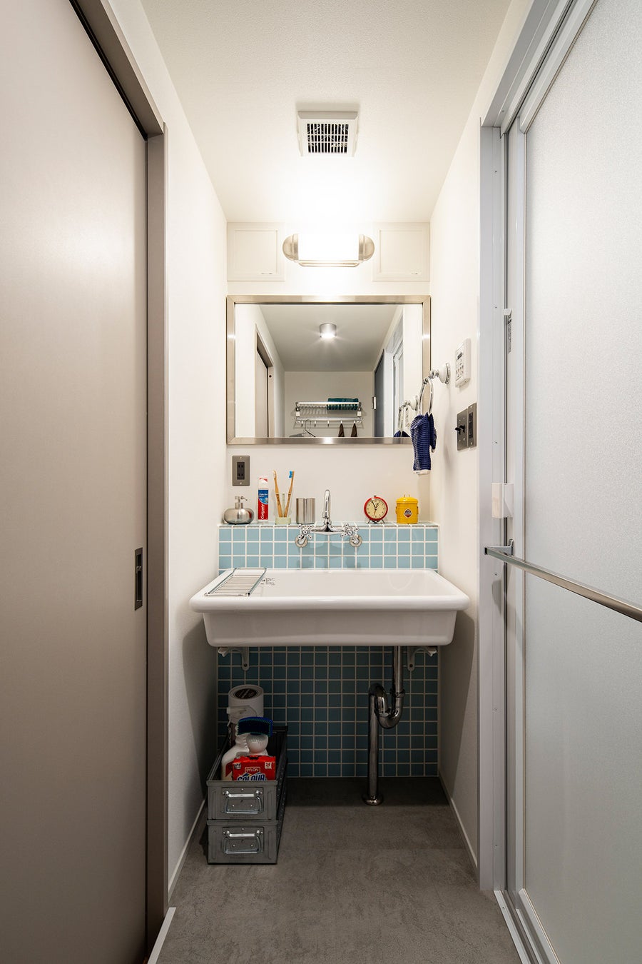 落ち着きのあるリビングダイニングと比べ、洗面室は水色のタイルがアクセントになった清潔感のある明るい空間に仕上げました。