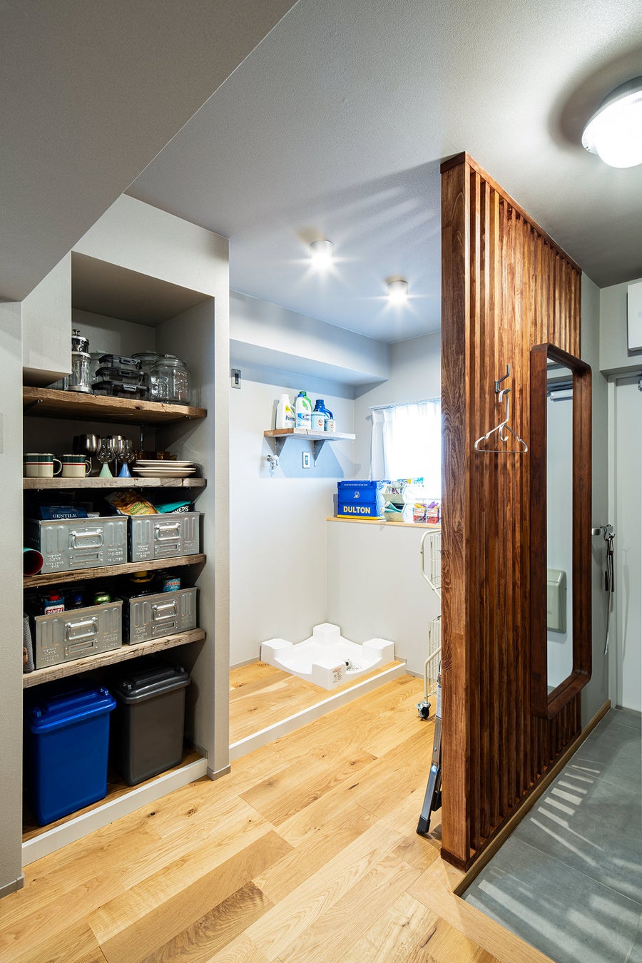 ものが多くなりがちな玄関まわりには、壁にも収納の工夫があります。アルミのバーハンドルを傘掛けや靴べら掛け、スリッパ収納として活用。キーストレージやハンガーを掛けられるフックを各所に取り付けるなど、ダルトンらしい遊び心溢れる収納の工夫を玄関にも散りばめました。家事スペースとの間の格子にも、掃除道具やエプロン、お買い物バッグなどを掛けられるフックを取り付けています。また、格子の色はダルトンオリジナルのミラーと合わせて、ダークブラウンに塗装しました。