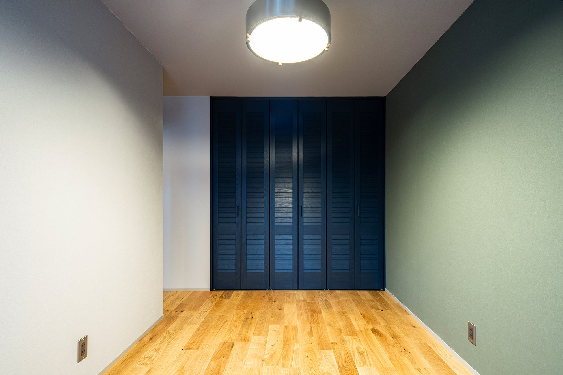 リビングから回遊できる寝室スペースには、大容量のクローゼットを設置。オリーブグリーン色のアクセントクロスとネイビーの建具で全体に落ち着いたインテリアが似合う部屋にしています。