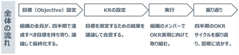 OKRではまずObjective(目標)を定め、それからKey Results(目標が達成されたか?を測定するための主な結果指標)を設定します。そして、OKRの実現に向けて、チーム全員で取り組みます。