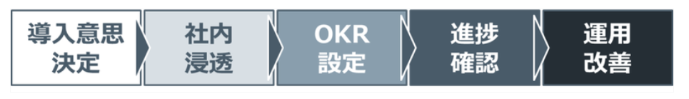 OKR導入のためには、社内の意思決定者から導入の合意を得、導入決定後に社内に浸透させ、OKRを設定し、週次ミーティングを行い、運用を改善するという流れを辿るのがスムーズです。