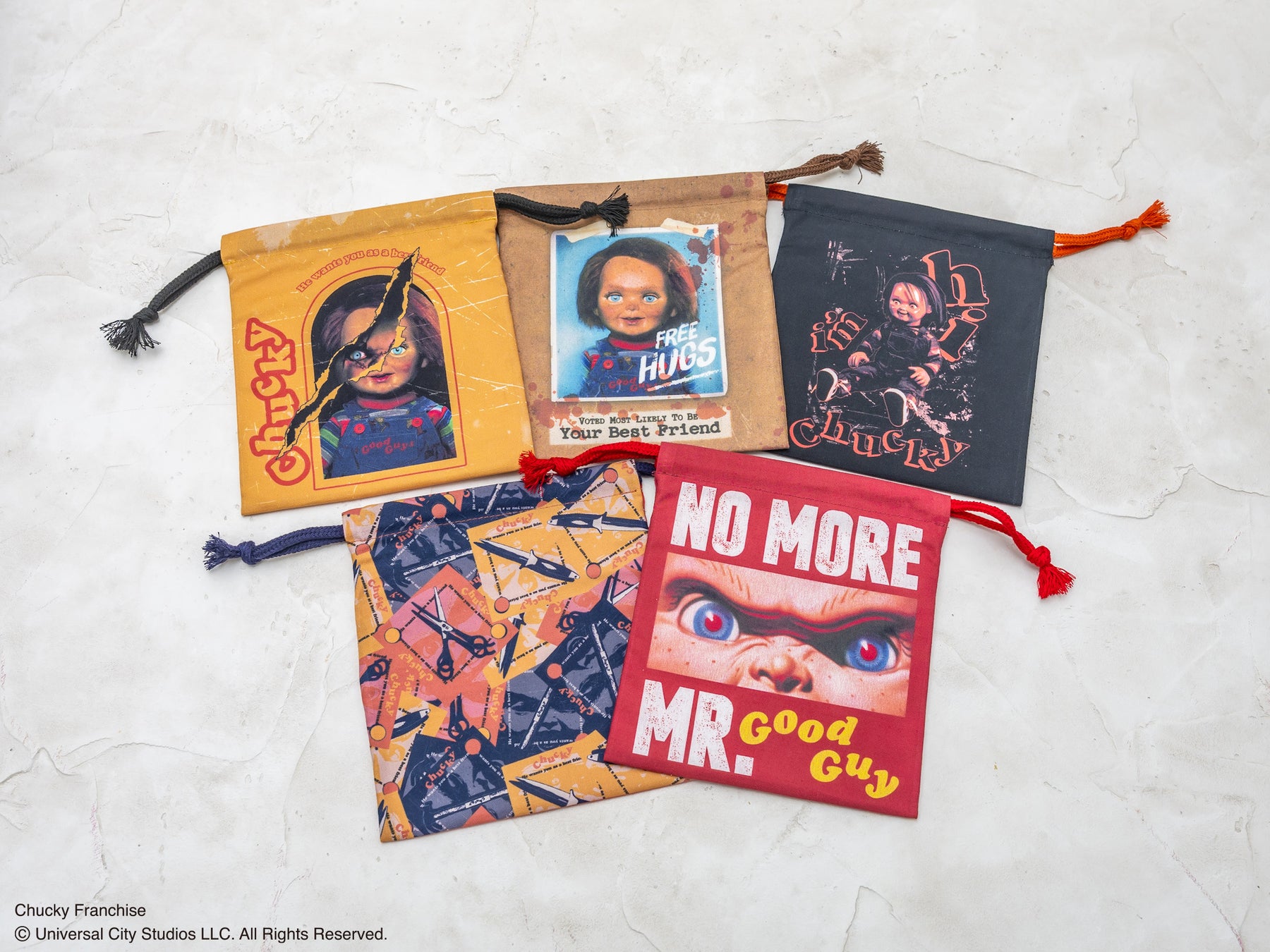 そのアイコンである「チャッキー」の、「Good Guys」人形としての愛らしさと、殺人鬼としての狂気という二面性を表現したデザイン巾着が登場しました。