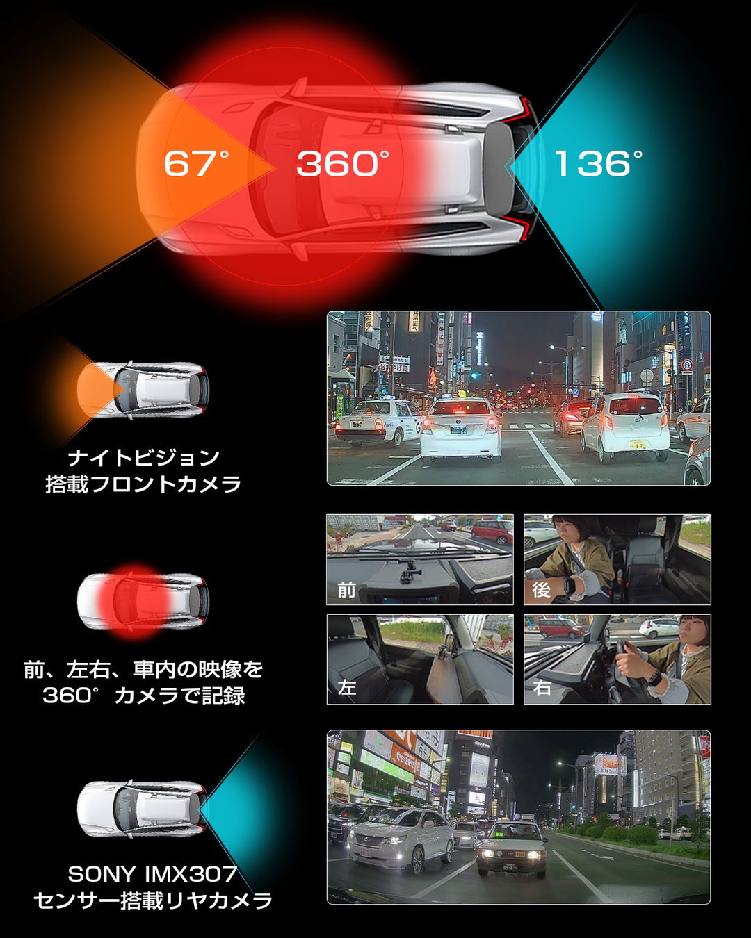 360°全方位カメラ:水平視野角360° + 垂直視野角220° パノラマレンズ(前後・左右・車内の映像を全方位で記録)