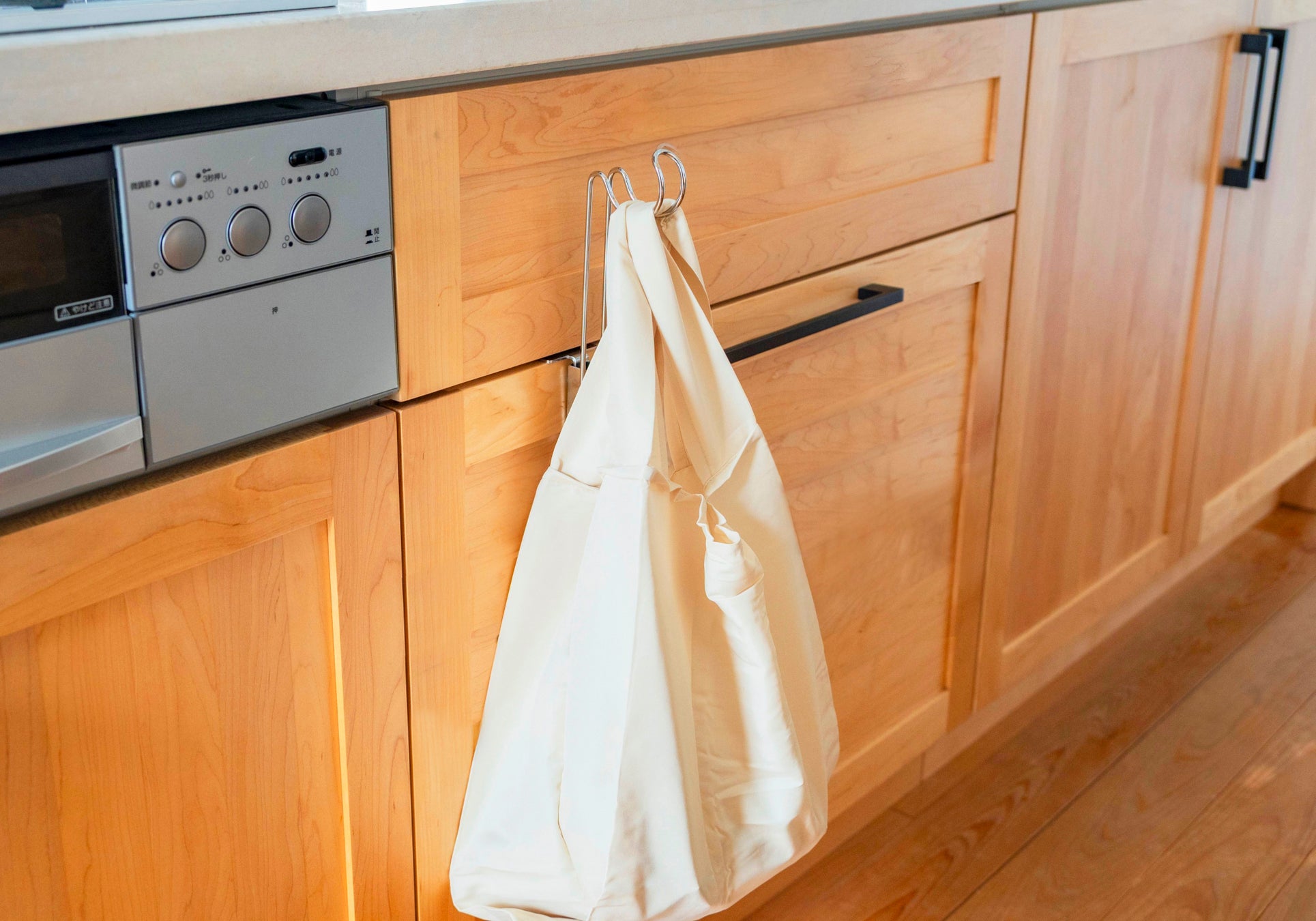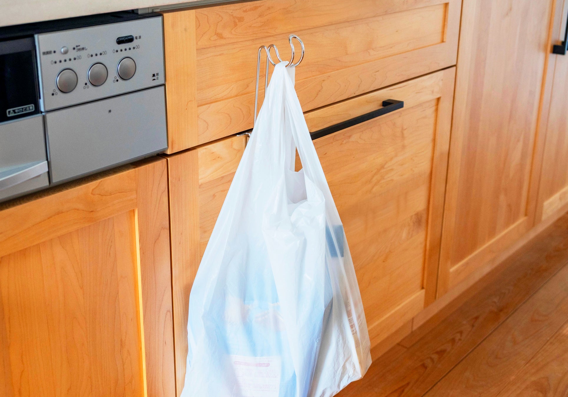 さらに、タオルだけでなくループ付きタオルやエコバッグ、ビニール袋なども掛けられる多用途仕様。日常的に使うアイテムも掛けられるため、簡易的なゴミ袋掛けとして使ったり、スーパーやコンビニから帰った際にエコバッグやレジ袋を一時的に掛けておいたりと、幅広いシーンで活躍します。