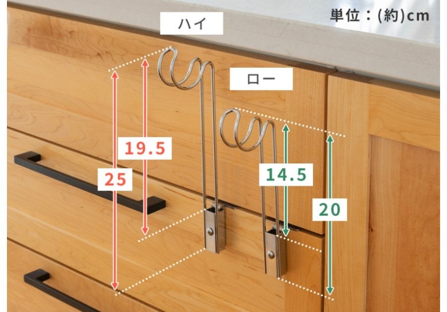 一般的なタオルホルダーよりも高い位置に固定できるため、調理や洗い物の途中でも自然な動作でサッと手を拭くことができます。腰をかがめる必要がなく、毎日のキッチンワークをより快適にする設計です。