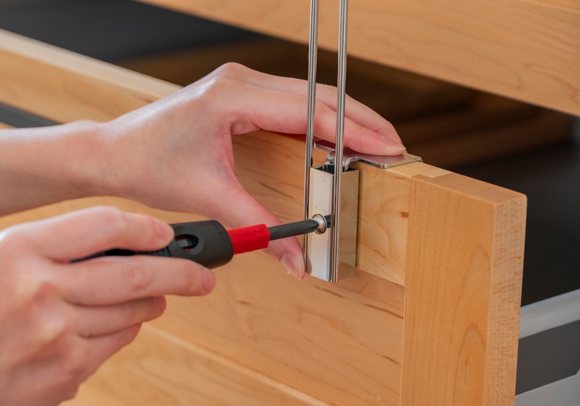引き出しの厚み(約1.5cm〜2.4cm)に合わせて調整でき、幅広いキッチンに対応可能です。設置はドライバー1本で簡単に行えるため、特別な工具や複雑な作業は不要で手軽に取り付けられます。