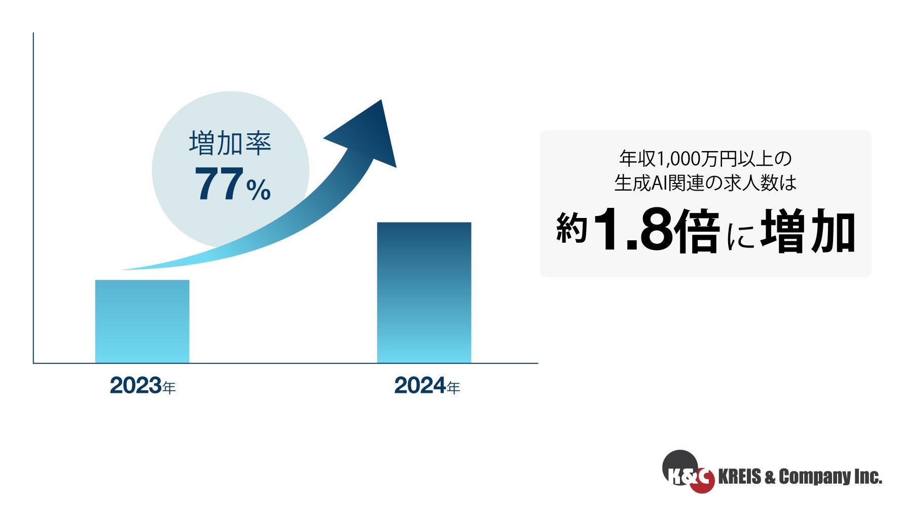 ハイクラス転職支援の株式会社クライス&カンパニー(本社所在地:東京都港区、代表取締役社長:丸山 貴宏)は、当社が保有する求人データをもとに集計した結果、2024年の生成AI関連求人件数は前年比で約2倍に増加し、年収1,000万円を超える高年収求人も前年比で約1.8倍となり、過去最多を記録したことをお知らせいたします。