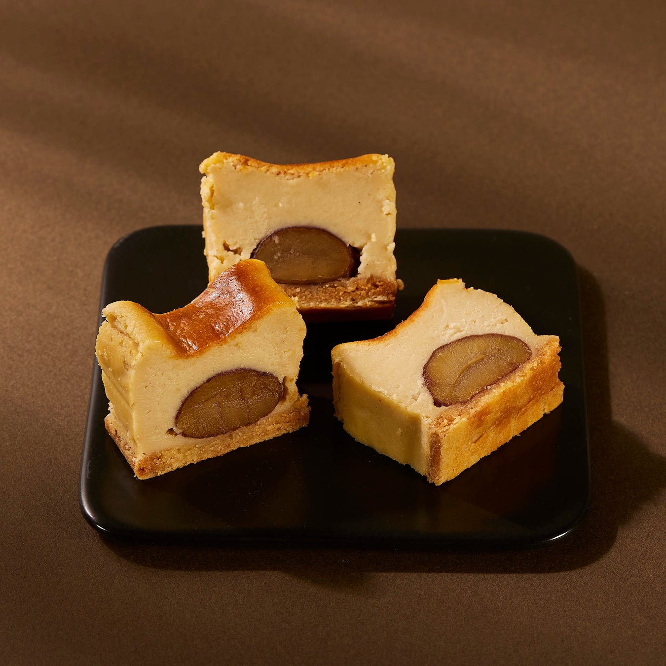 クッキー生地の上にまるごとの栗をぎっしりと並べ、北海道産のクリームチーズと茨城県産「利平栗」のペーストをチーズケーキに練り込み、じっくりと焼き上げました。