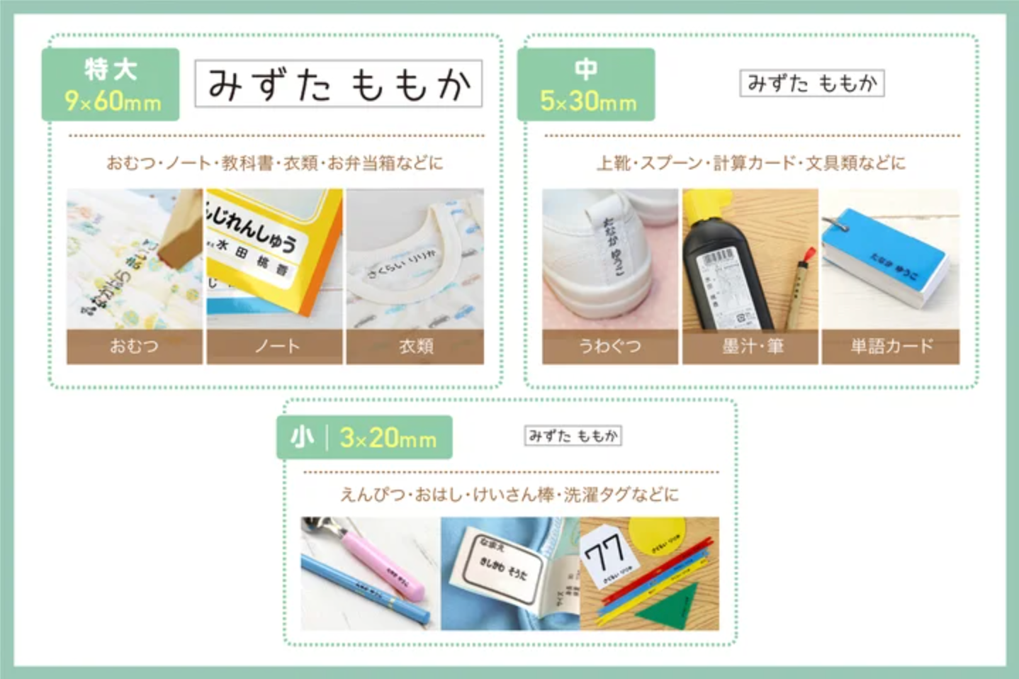 【対象商品】3サイズのお名前スタンプで、様々な持ちものへの名前つけに対応。マイマークと認識できるイラストスタンプも全40種類から1種えらべる