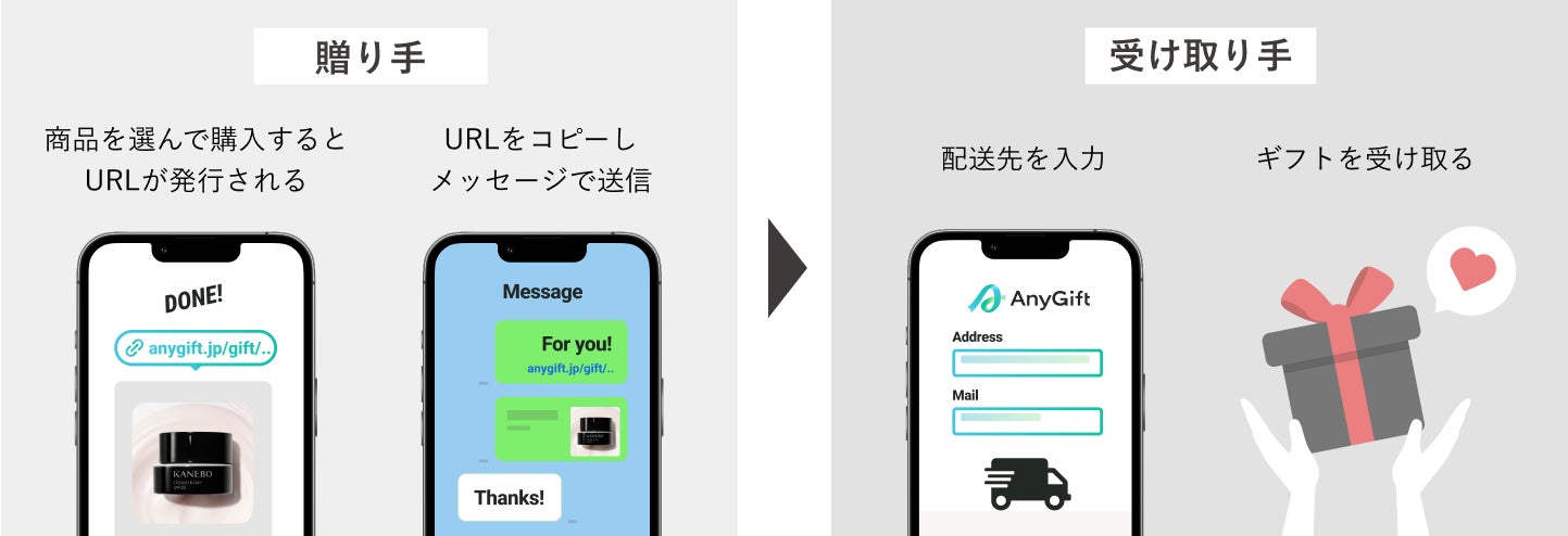 AnyGiftは、相手の住所を知らなくてもLINEやメールで贈ることができる"eギフト機能"を、ECサイトに組み込むことができるサービスです。