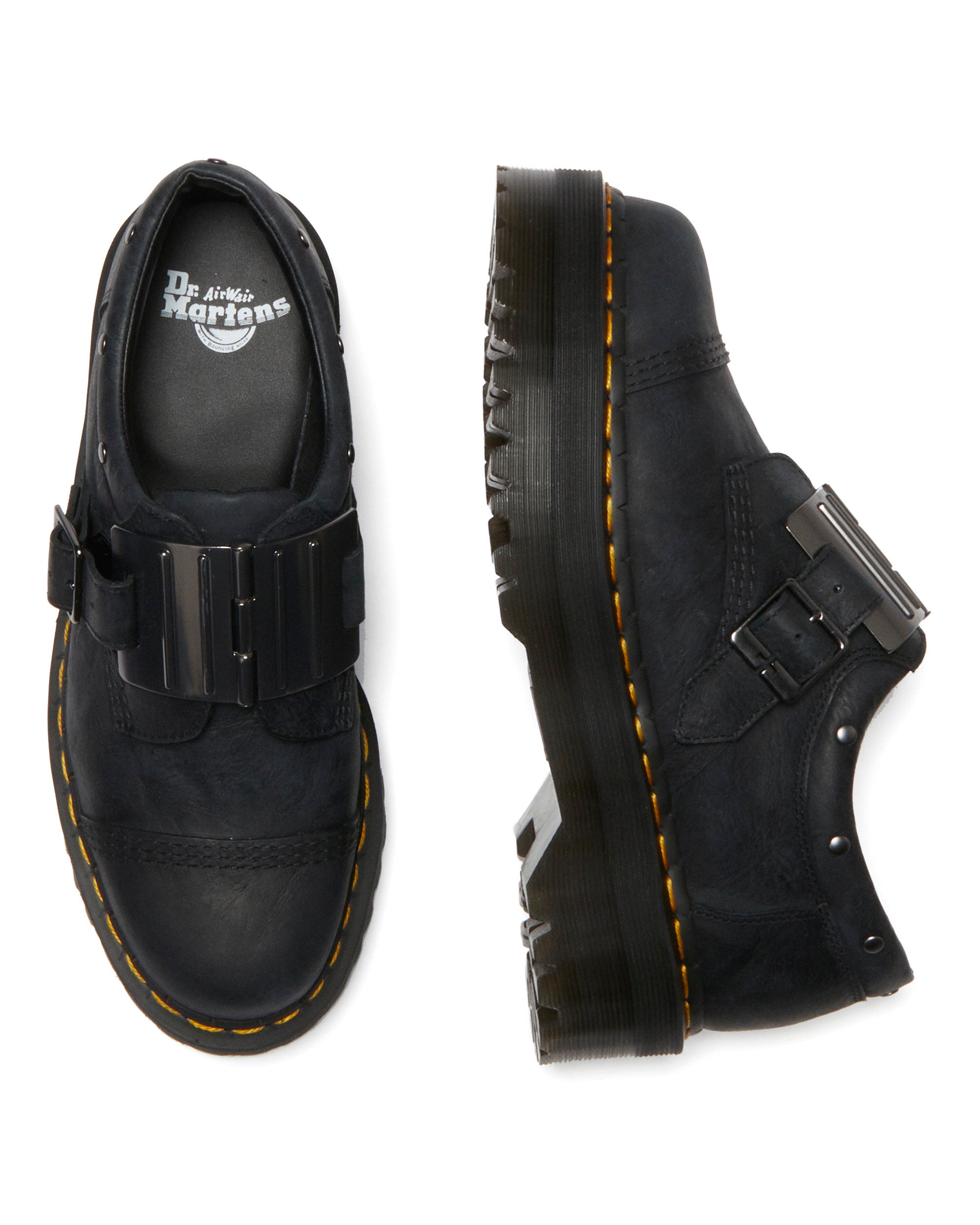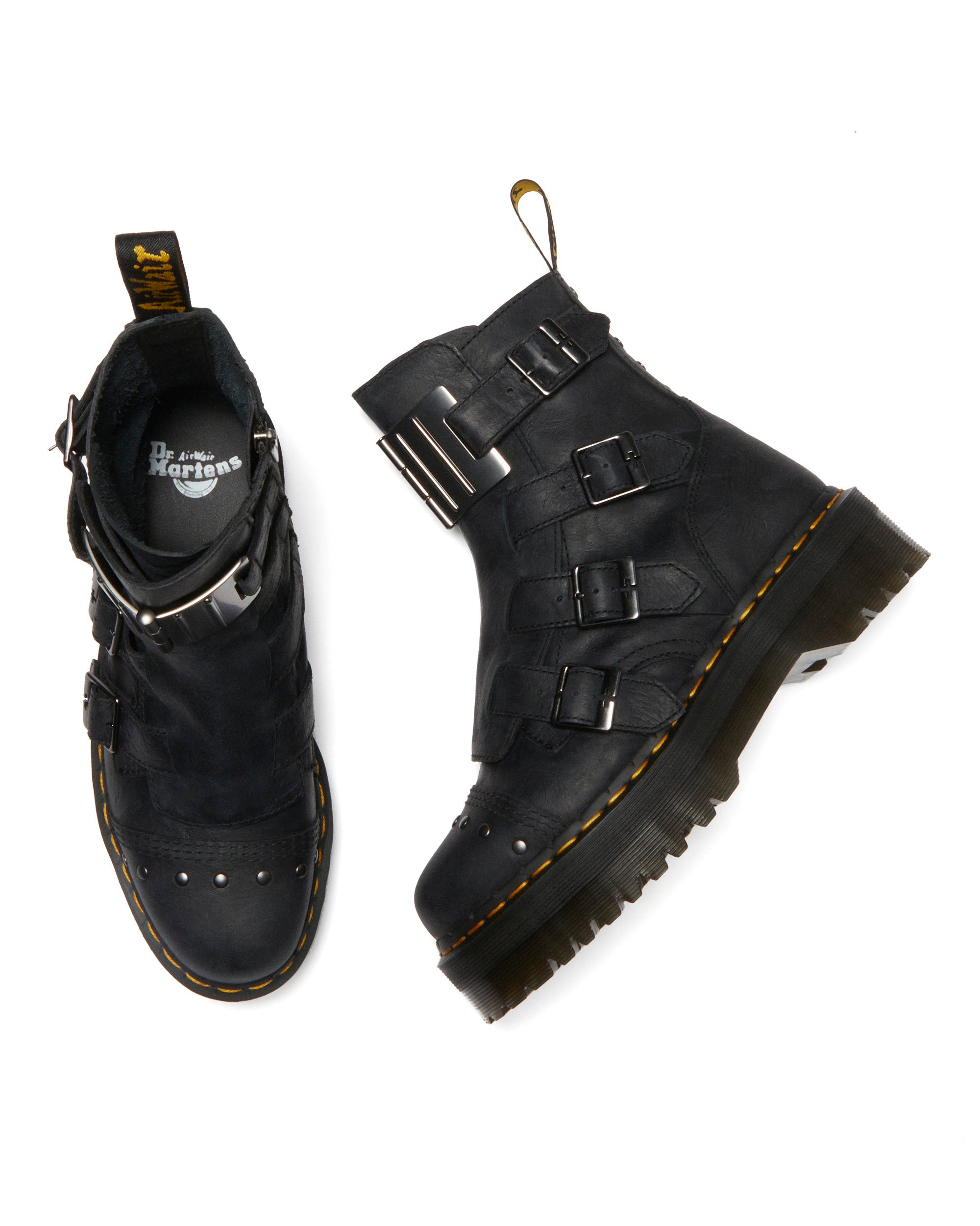 ヒンジコレクションのジェイドンブーツ、8053シューズはいずれも、ドクターマーチンの歴史からデザインを引用したシンガード(すね部分のパーツ)から着想を得たオーバーサイズのガンメタルスタッズとヒンジバックルで装飾され、新たなデザインを表現。ブランドを象徴する、アイコニックなイエローウェルトステッチで仕上げられています。
