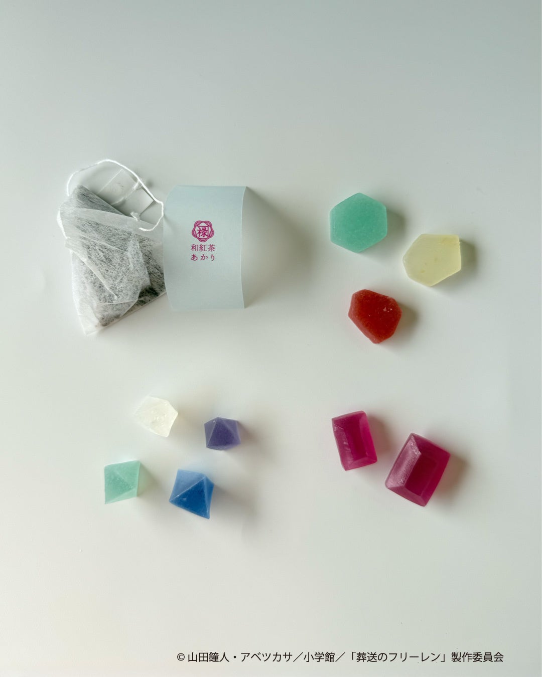 6月22日(日)より福岡三越9階「三越ギャラリー」にてスタートする「アニメ 葬送のフリーレン展」にて、こうぶつヲカシとのコラボお菓子の販売が決定しました。ハラペコラボのこうぶつヲカシは、ひとつひとつ職人が小刀で切り出すアート作品のような寒天菓子【琥珀糖】で、リアルな鉱物や宝石を模しているのが特徴。福岡会場の限定商品『葬送のフリーレンオリジナルこうぶつヲカシ』には、ルビー色の宝石、蛍石、九州素材の琥珀糖、こだわりの和紅茶のティーバッグが入り、存分にお楽しみいただける一箱になっています。イベントキービジュアルのイラスト入りパッケージに、キャラクターのステッカー1枚つき。