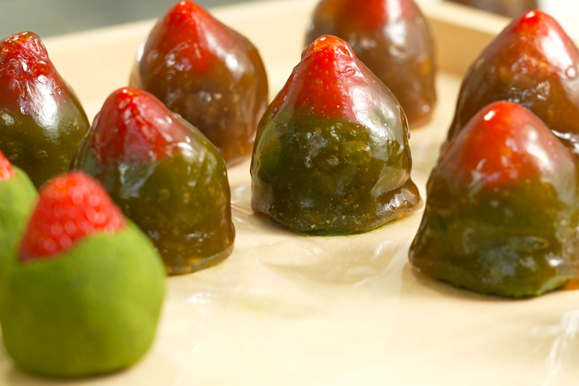 食べた瞬間に、いちご・あんこ・わらび餅がちょうど良く重なり合うところを目指し、それぞれ糖度や分量など、細部にわたって職人が何度も調整をおこないました。 宝石のようなキラキラとした見た目や、頬張りたくなるようなかわいらしいフォルムは、お手土産にもぴったり。