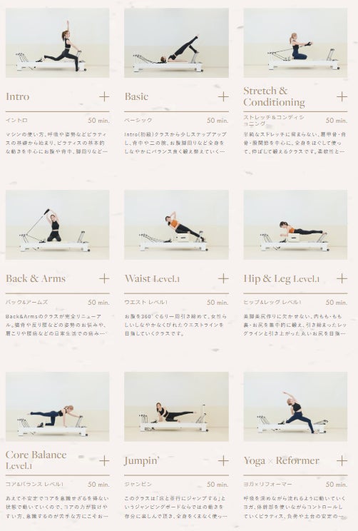 the SILKではマット&リフォーマーグランドマスターの資格を持つプロのインストラクターが、以下のプログラムを開発しており、現在は14種類のメニューをご用意しています。