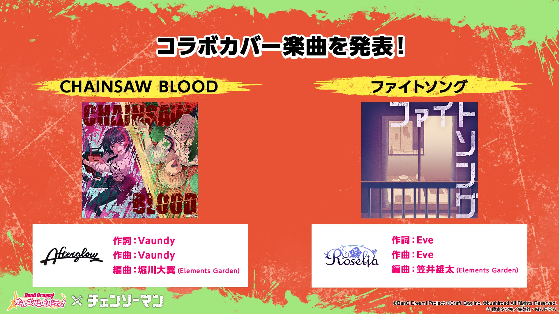 コラボレーション企画の開催を記念して、コラボカバー楽曲を合計2曲追加いたします。コラボカバー楽曲は、Afterglowが歌う『CHAINSAW BLOOD』(作詞:Vaundy・作曲:Vaundy・編曲:堀川大翼(Elements Garden))と、Roseliaが歌う『ファイトソング』(作詞:Eve・作曲:Eve・編曲:笠井雄太(Elements Garden))に決定いたしました。コラボカバー楽曲は、コラボ開始時の2023年6月30日(金)15時に追加いたします。