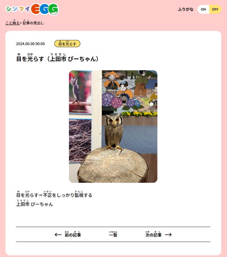 信濃毎日新聞の地域面などに掲載された身近なニュースを子どもたちが読みやすいよう、振り仮名のオンオフ機能を付けました。小学生や外国にルーツを持つ中学生など、まだ漢字の読み書きが苦手な子がクラスいても「新聞」を授業で活用できます。