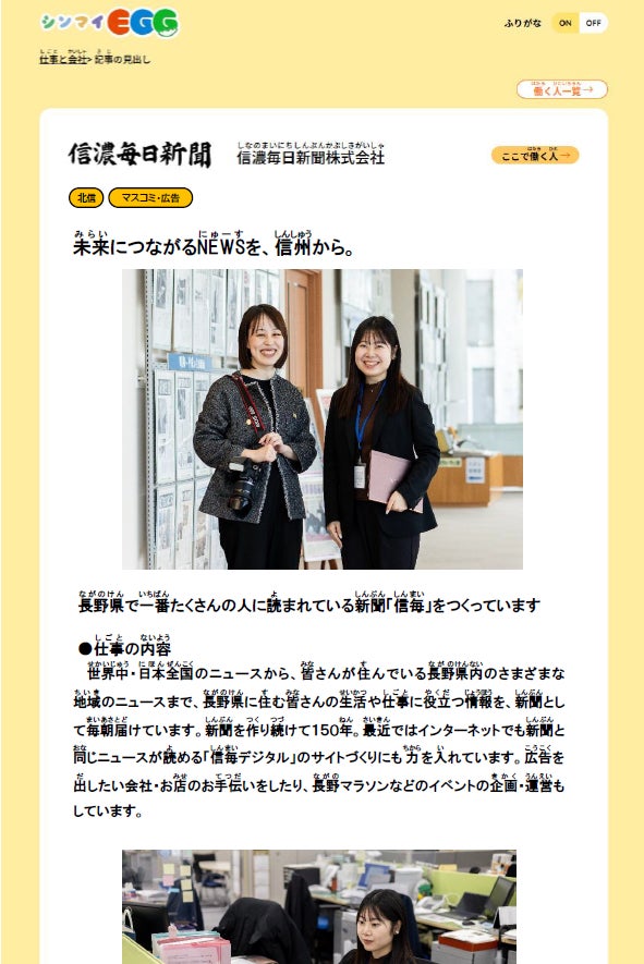 長野県内の企業、職場の仕事内容やそこで働く人たちをやわらかく紹介します。各企業ごとに会社見学や職場体験の受け入れが可能かといった補足情報も掲載。教育現場と地域経済の関わりを後押ししています。