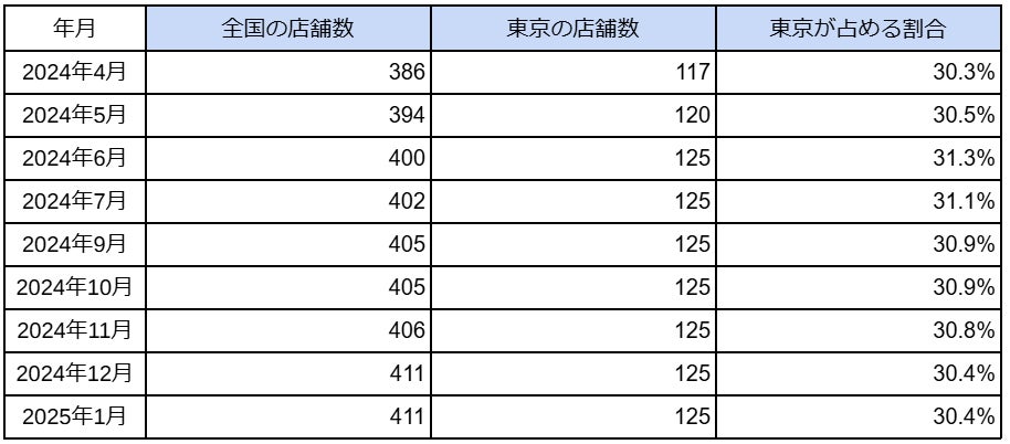 アミューズメントポーカールームの2025年1月時点の最新の国内店舗数を見てみると、全国で411店舗となっています。このうち東京にあるポーカールームは125店舗であり、前月12月から増減はありません。