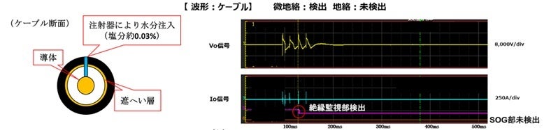 「絶縁監視部」、「SOG部」共に未検出状態から、まず「絶縁監視部」が検出し始め、数回地絡を繰り返すと「SOG部」も動作するようになります。)