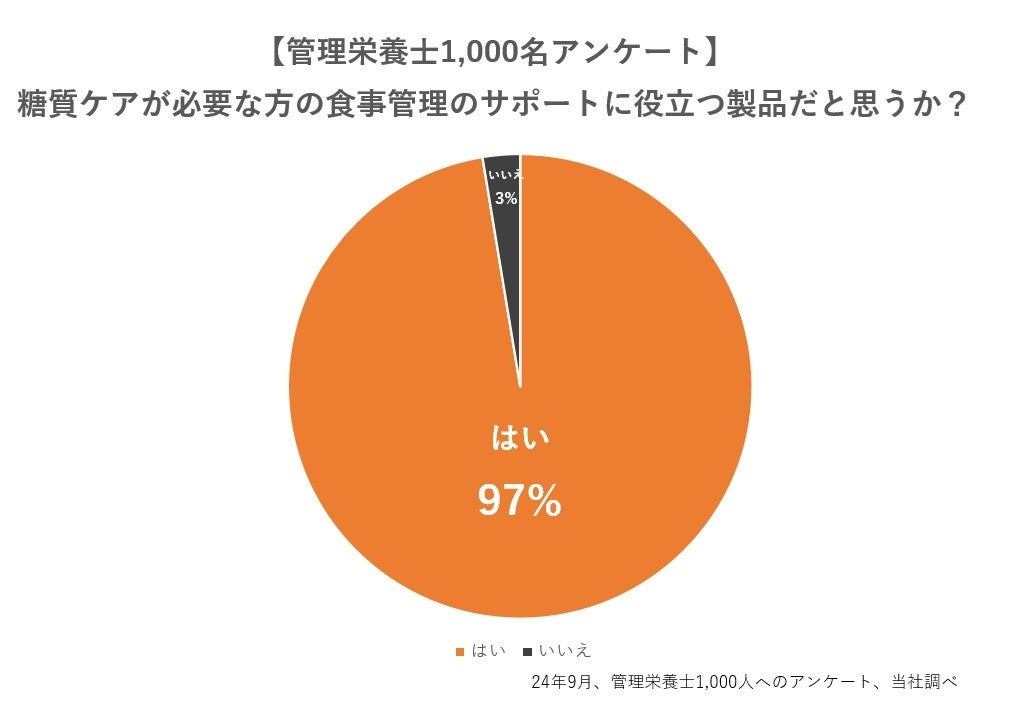 さらに、管理栄養士1,000名に対して行ったアンケートでは、1,000名中974名(97%)が「糖質ケアが必要な方の食事管理のサポートに役立つ製品だと思う」と回答しました。「農村で自ら収穫したおいしいお米を食べておられる方が多いエリアで働いているが、そのお米に簡単にプラスできる」「わかっていても食べちゃうという方に良い」というコメントも得られました。