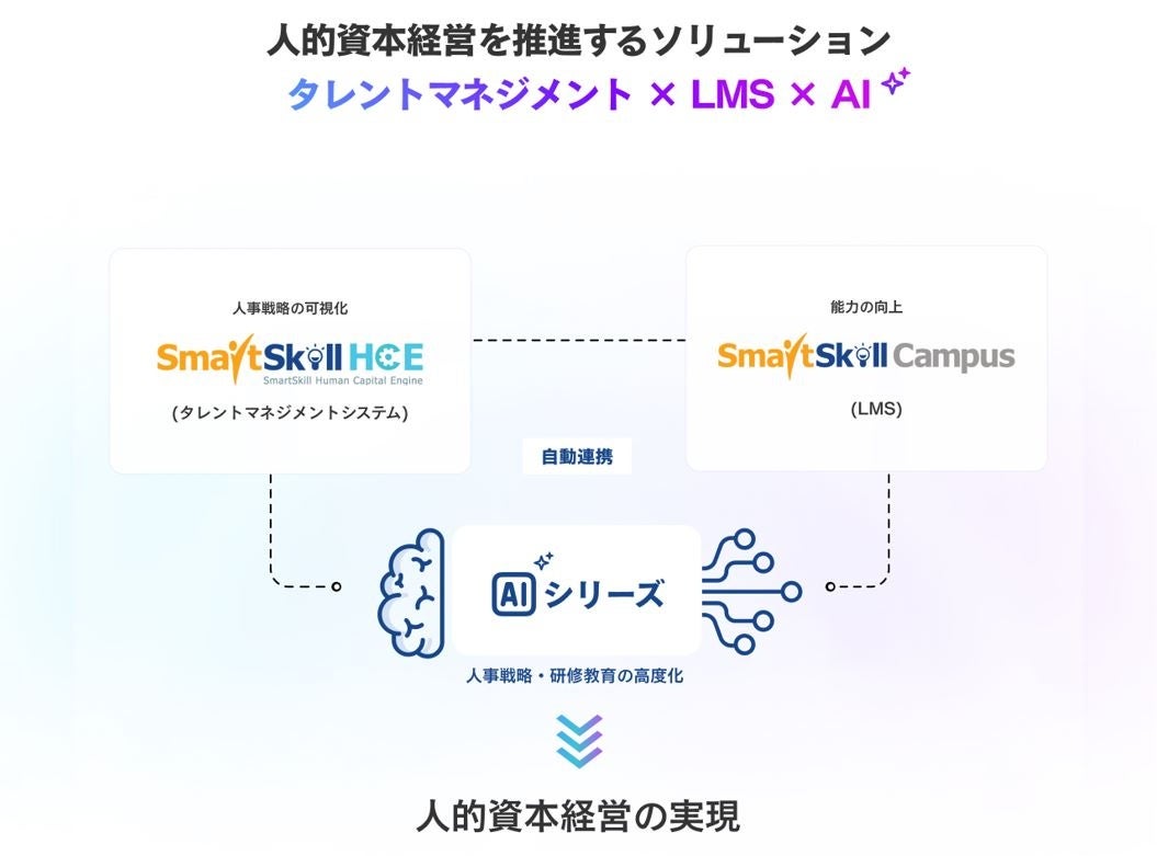 「SmartSkill HCE」は、人的資本経営を実現するためのタレントマネジメントシステムです。経営層の意思決定に必要な人事データに関する指標をさまざまな切り口から可視化し、データをビジュアライズ化して一目でわかりやすく表示。また、能力の向上を実行する「LMS(SmartSkill Campus)」、人事戦略・研修教育を高度化する「AI(AIシリーズ)」との自動連携により、スキルギャップを埋めるパーソナライズされた学びを提供し、従業員の人的資本価値を向上します。