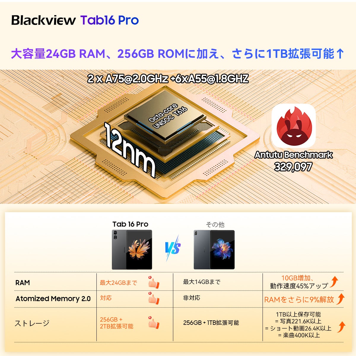 大容量24GB RAM、256GB ROM、2TBの拡張可能ストレージ