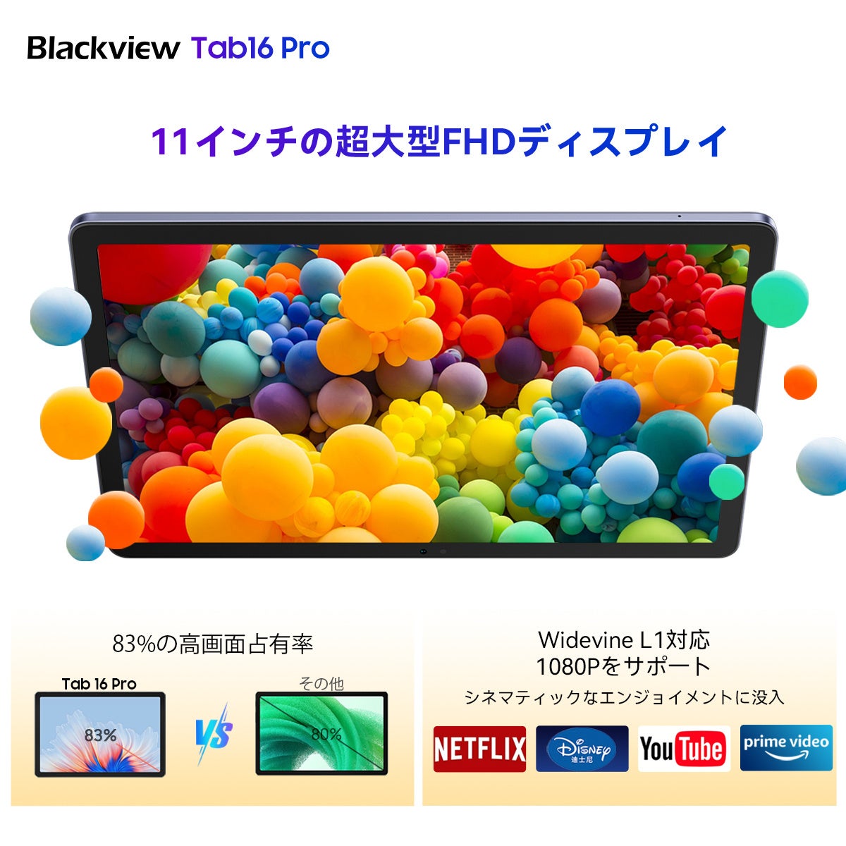 Blackview Tab 16 Proは筐体に対するディスプレイ比率が83%(前モデルは80%)に向上しており、動画視聴から仕事、ゲーミングまで大きな画面で存分に楽しめるようになっています。