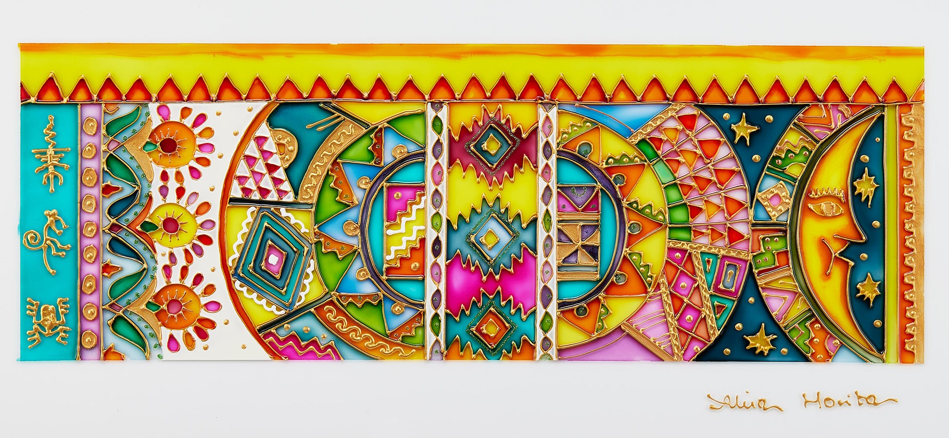 ペルヴィアン・テキスタイルを基本としたカラフルなデザインに、アステカの重要なシンボルである「太陽」や「月」のモチーフを配置。