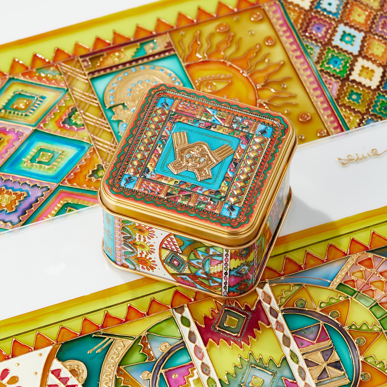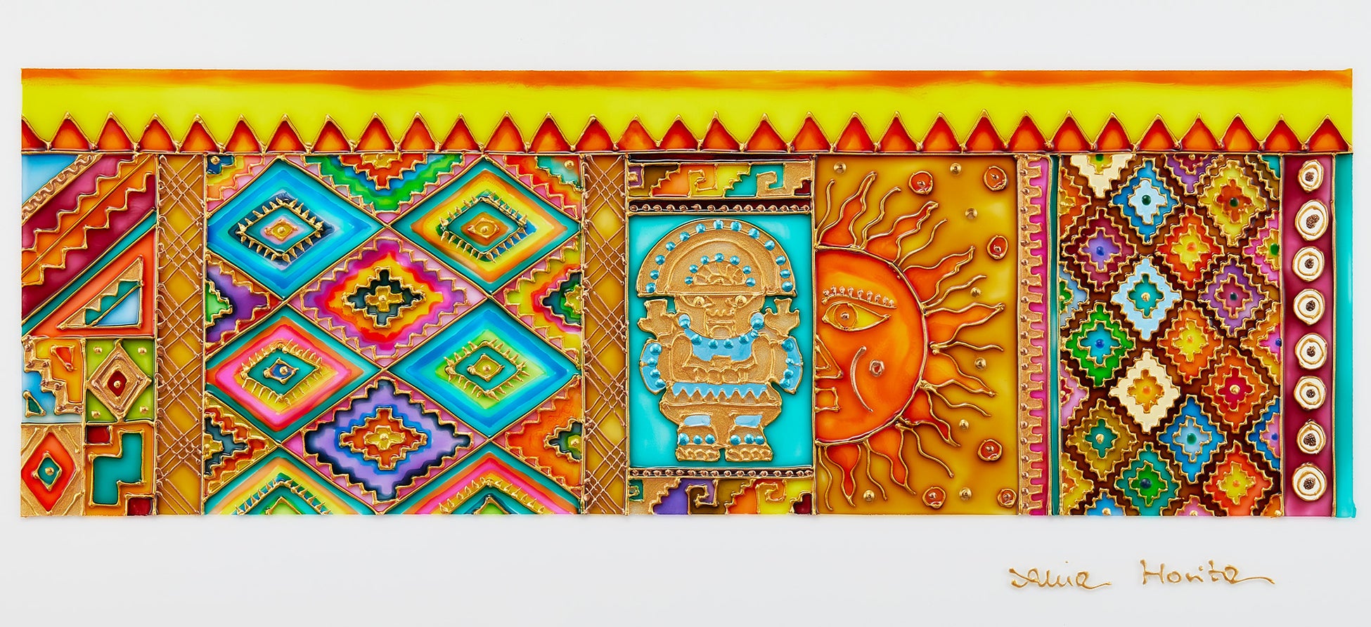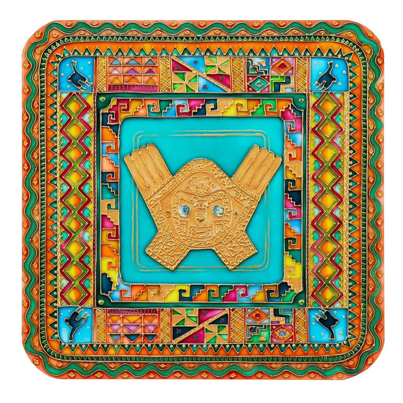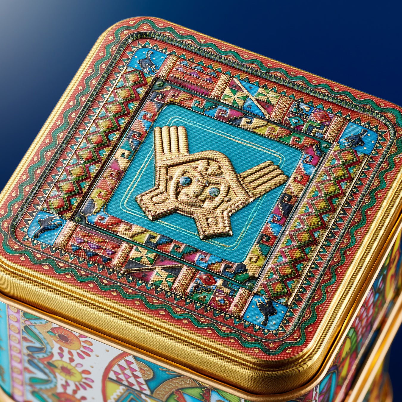 インカ時代の黄金の飾りやナスカの地上絵などの神秘的なオブジェクトと、ペルーのお皿などに見られる民芸模様の融合をお楽しみください。