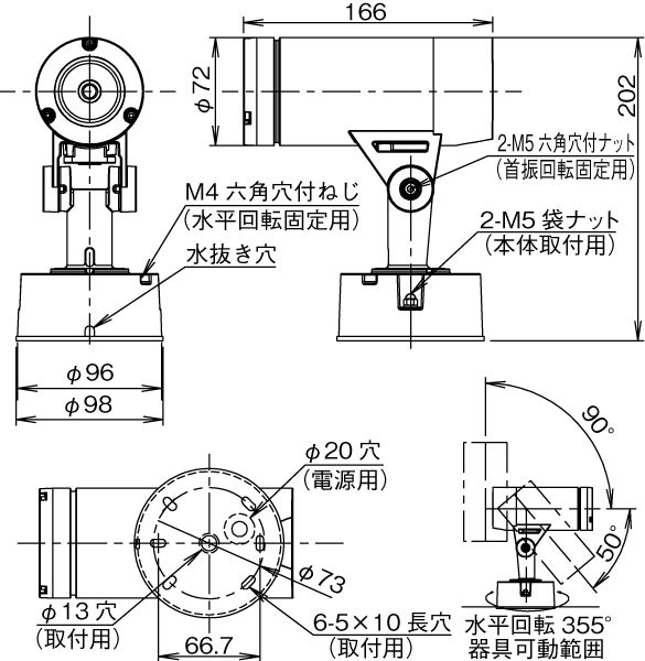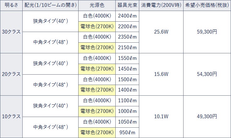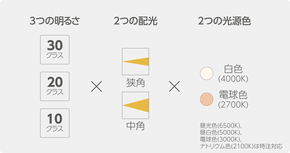 3つの明るさ(30・20・10クラス)、2つの配光(狭角・中角)タイプ、2つの光源色(白色・電球色)の12形式を標準ラインアップ。