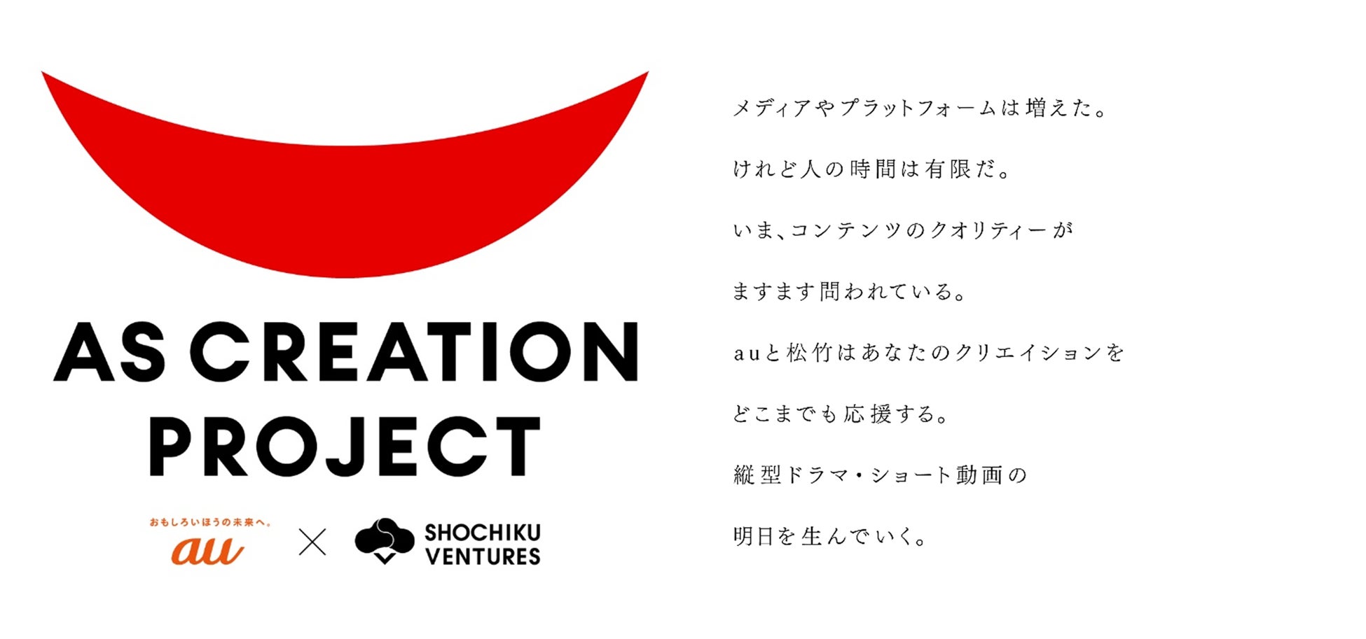 KDDI株式会社(本社:東京都千代田区、代表取締役社長 CEO:髙橋誠、以下 KDDI)は2024年8月6日、松竹グループのコーポレート・ベンチャー・キャピタル(CVC)である松竹ベンチャーズ株式会社(本社:東京都中央区、代表取締役社長:井上貴弘、以下 松竹ベンチャーズ)とともに、ショート動画製作を支援するプロジェクト「AS CREATION PROJECT(アスクリエイションプロジェクト)」を開始したことをお知らせします。