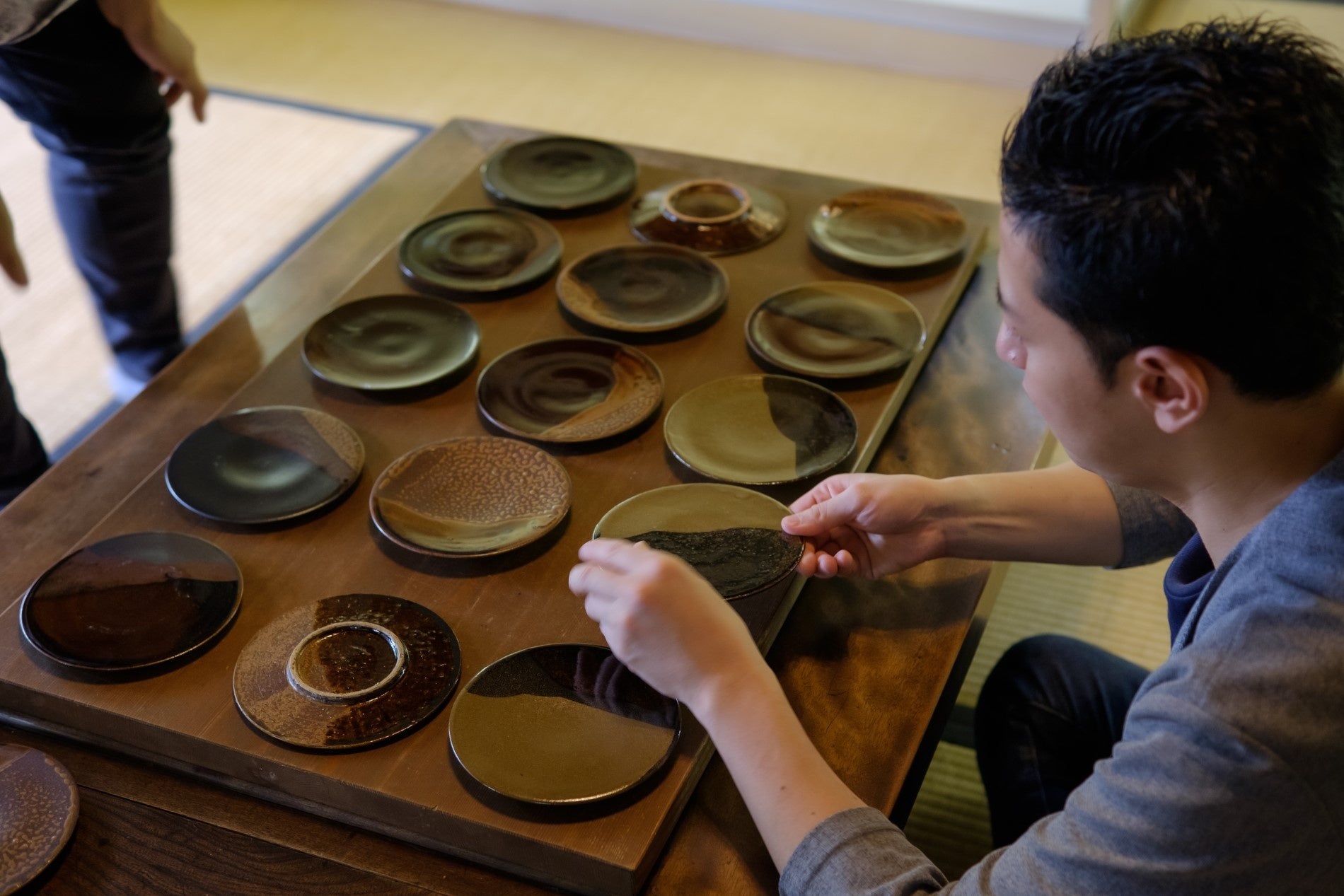 福岡県朝倉郡東峰村の静かな山間に流れる清流の水音が聞こえる地に、髙取焼宗家はあります。その土地の空気や春慶氏との会話に様々なインスピレーションを受けた窪津は、思い描く新たなパン皿のイメージを春慶氏に伝えました。二人の会話は、器の形、高台(こうだい)の高さ、手触り、レストランでお皿にパンをサービスする時の条件など、多岐に渡りました。