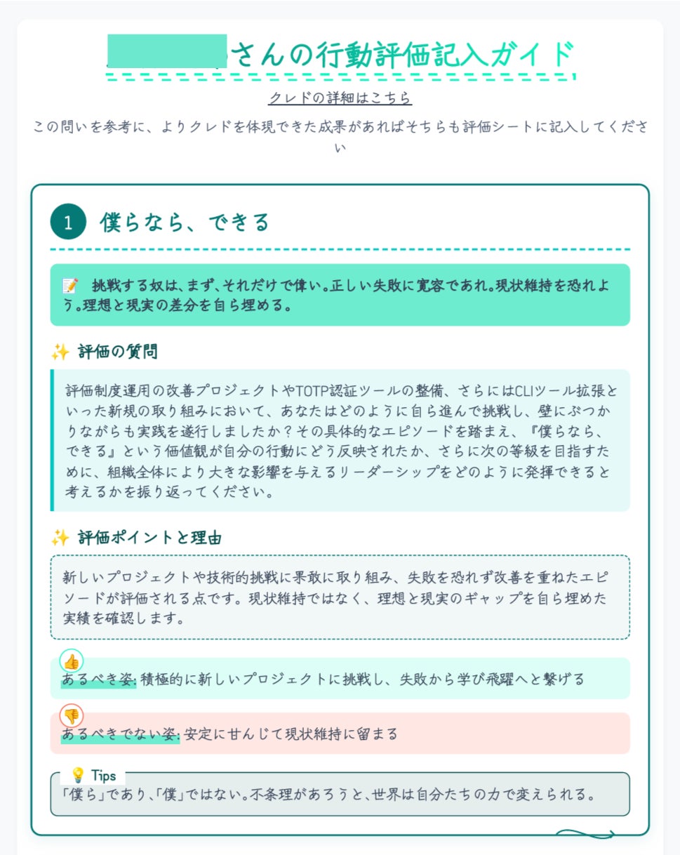 行動評価ガイドの導入により、被評価者が自らのクレドや行動に照らして振り返ることが可能となり、フィードバックの質も向上しています。