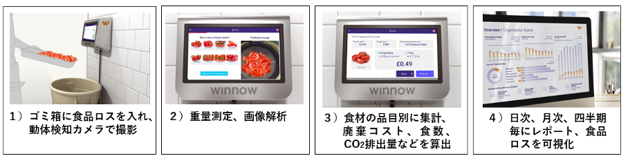 Winnowのポイントは「把握・改善・環境」の3点。動体検知カメラを内蔵したAI搭載システムにより、食品残渣を食材品目別に集計。廃棄コストや削減可能な食数、CO2排出量を算出いたします。収益に影響する食品ロスをランキングで確認できるため、無駄な食材を把握することが可能となります。また、オペレーションの改善や廃棄削減を促進するためのレポートも配布されます。