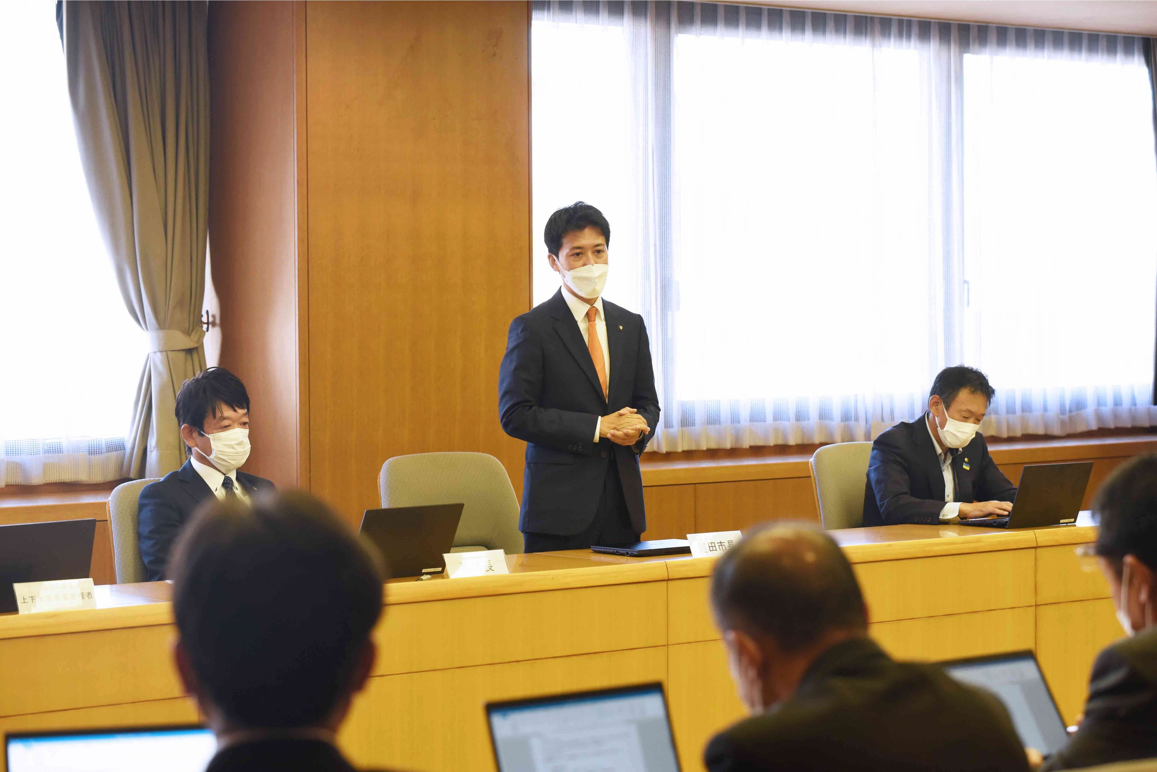 就任のあいさつで越田市長は「今回の選挙はこの4年間の私自身の評価であるとともに一緒に仕事をしてきた職員の皆さんの評価であり、これまで進めてきた改革をもっと頑張ってほしいというメッセージでもあると思っています。2期目のスタートにあたって皆さんに求めたいことは二つあり、一つ目は、市民を幸せにする、市民に貢献するという仕事を通じて職員一人一人が幸せになってほしいということ。二つ目は、誠実であってほしいということ。市民に対して、仲間に対して、家族に対して誠実に向き合ってほしい。また、2期目の大きなテーマとして「こだわっていく」という思いを共有したいと思います。こだわることは三つ。一つ目はプロセスにこだわるということ。政治や行政の評価は10年後20年後30年後に評価されるのが宿命。結果が仮に間違っていたとしても、民主主義としてのプロセスにしっかりとこだわっていただきたい。二つ目は実行にこだわるということ。今回掲げた50項目のマニフェストは市民の皆さんとの契約でもあり、他の仕事もやるといったからには実行することにこだわりたい。三つ目は成果にこだわるということ。事業を実施するにあたって本当に市民が幸せになったのかという成果にこだわってほしい。これからの4年間、新時代第2章の改革が加速する。今までと同じスピード感では市民からの期待に応えることはできません。さらにアクセルを踏んでこの4年間頑張っていきたいと思うので、どうか力を貸していただきたい」などと話した。