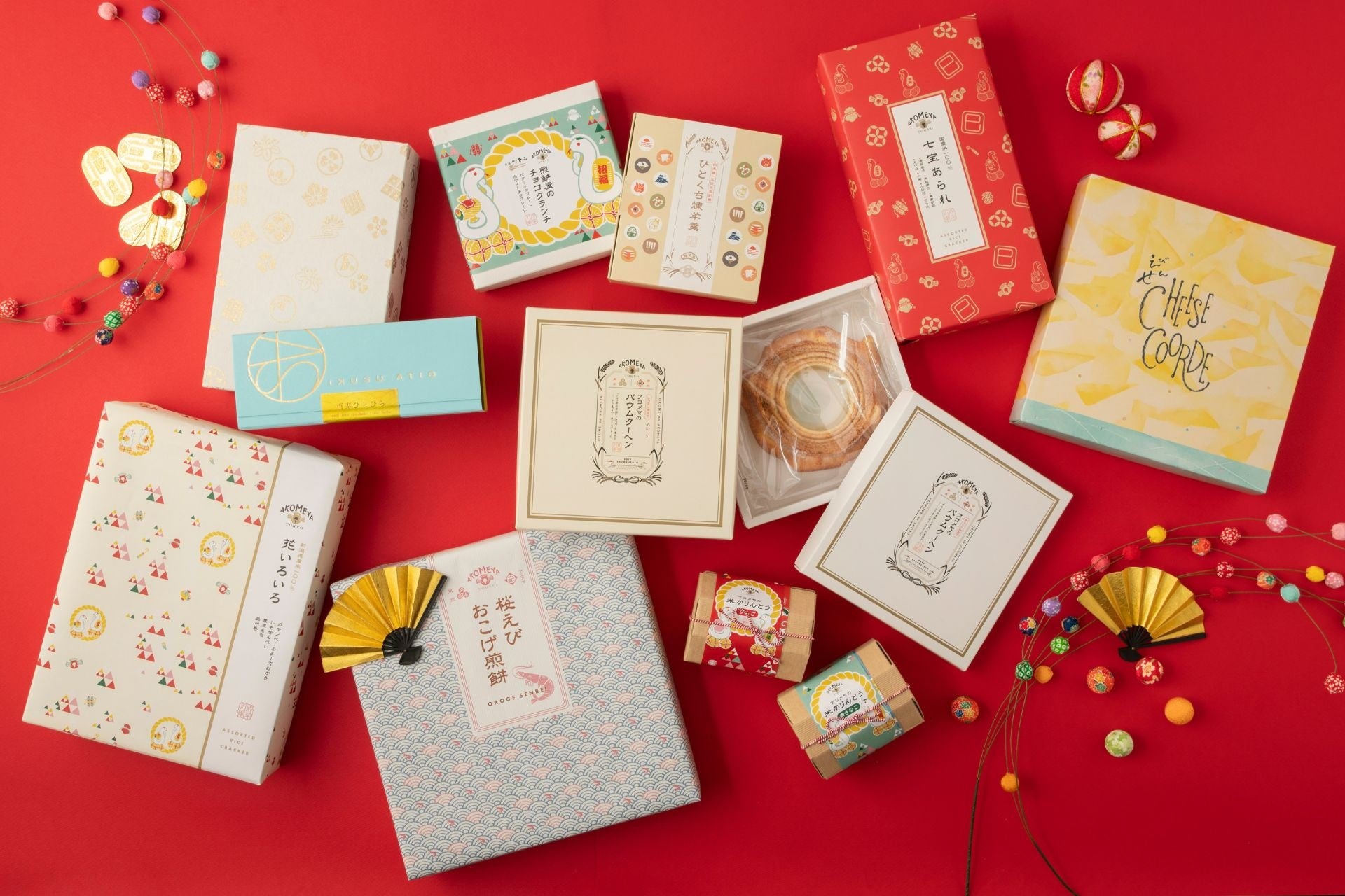 お年賀限定デザインの七宝あられや花いろいろ、煎餅屋のチョコクランチ、米かりんとうや、「アコメヤの米粉」を使用した大人気のオリジナルバウムクーヘンなど、ご挨拶にぴったりな箱菓子各種をご用意しました。
